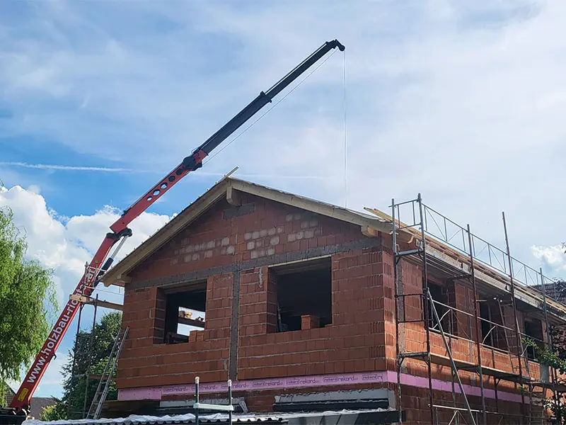 Der Kranwagens sorgt zudem für eine zügige Zuführung des Materials direkt in den Baubereich, wodurch Zeit und Aufwand deutlich reduziert werden.